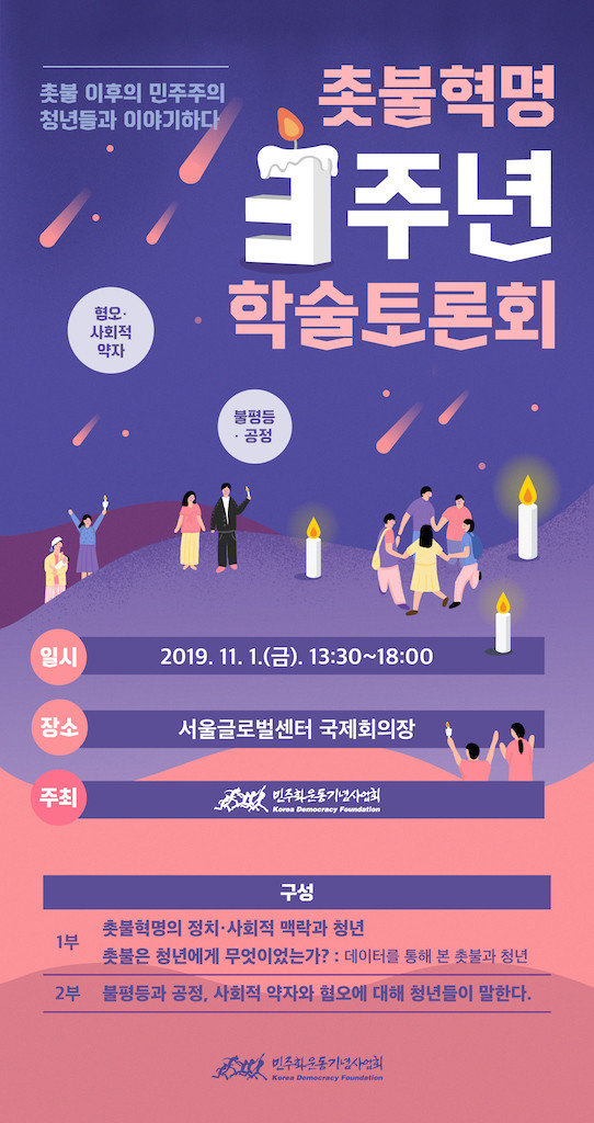 우리 사회의 갈등이 고조되고, 한국 민주주의의 위기가 심화되고 있는 가운데 열리는 촛불혁명 3주년 학술토론회의 1부 사회는 김동춘(한국민주주의연구소 소장, 성공회대 교수)이, 2부 사회는 윤희숙(퇴진행동 기록위원회 사무국장) 씨가 맡는다.