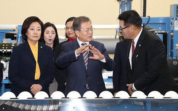 | ▲ 문재인 대통령이 11월 22일 오전 천안 MEMC코리아 공장에서 300mm 웨이퍼 절삭 공정을 시찰하고 있다. 왼쪽부터 박영선 중소벤처기업부 장관, 문 대통령, 조찬래 MEMC코리아 사장. <사진 : 연합뉴스> |