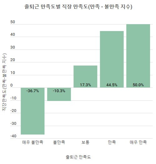 출퇴근 만족도에 따른 직장 만족도를 분석한 결과 출퇴근에 대한 만족도가 높을수록 직장 만족도가 비례하여 높아지는 추세를 보였다. 출퇴근 만족도별 직장 만족도(만족 - 불만족 지수) 그래프를 통해서 더욱 분명한 추세를 확인할 수 있다. 이는 인과관계는 분명하지 않지만 출퇴근 만족도와 직장 만족도 사이에 무시할 수 없는 상관관계가 있음을 시사하는 것으로, 양 변수 간 통계적 상관계수(r)는 0.31로 나왔다.