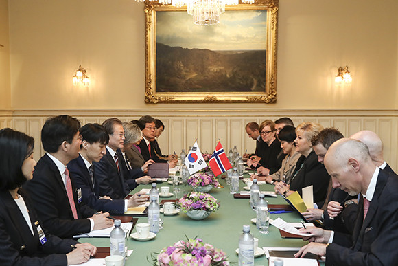문 대통령과 솔베르그 총리는 양국이 1959년 외교관계 수립 이래 다양한 분야에서 우호협력 관계를 발전시켜 온 것을 평가하고, 양국의 전통적 협력 분야인 조선·해양, 북극연구뿐만 아니라 과학기술, 방산, 대기 분야 연구 등으로 협력의 폭을 확대해 나가기로 했다.