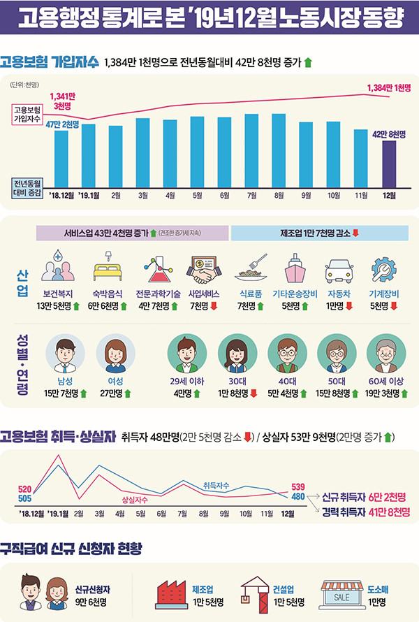 13일 고용노동부가 발표한 ‘고용행정 통계로 본 2019년 12월 노동시장 동향’에 따르면 지난달 고용보험 가입자 수는 전년도 12월에 비해 42만 8000명 늘어나 1384만 1000명을 기록했다.