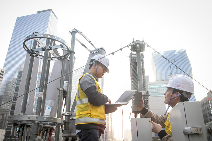 | ▲SK텔레콤 직원들이 강남역 사거리 인근에서 기지국 점검을 하고 있다 |