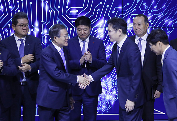 | ▲ 문재인 대통령과 이재용 삼성 부회장이 10일 열린 삼성디스플레이 신규 투자 및 상생협력 협약식에서 악수하고 있다. <사진 : 연합뉴스> |