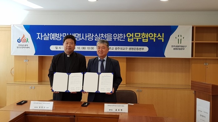 전라남도광역정신건강복지센터(센터장 윤보현)은 10일 자살예방의 날을 기념하며 종교계와 함께하는 ‘자살예방 및 생명사랑실천’을 위해 천주교 광주대교구 생명운동본부와 업무협약(MOU)을 체결했다.