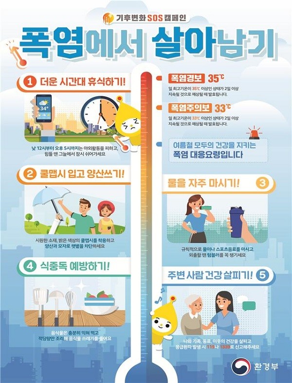 폭염 행동요령은 ▲더운 시간대 휴식하기 ▲시원한 옷을 입고 양산 쓰기 ▲물을 자주 마시기 ▲식중독 예방하기 ▲주변 사람 건강 살피기 등이다.