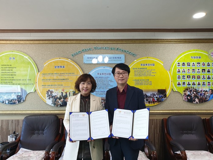 | ▲ 강원외국어교육원 홍광자 원장과 엠글리쉬 이만홍 대표가 업무협약 체결 후 기념사진을 찍고 있다. |