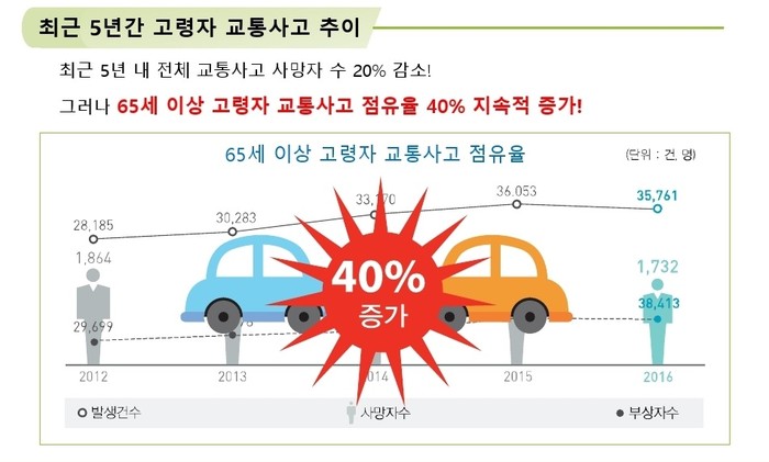 도로교통공단 교통사고분석시스템(TAAS)에 따르면 최근 5년 내 우리나라 전체 교통사고 사망자 수는 약 20% 감소했다. 반면 교통사고 사망자 중 고령운전자(65세 이상) 비중은 약 40%로 지속적으로 증가하는 추세를 보이고 있다.