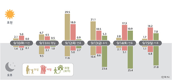 귀성·여행 시에는 추석 연휴 첫날인 12일 오전에 출발하겠다고 응답한 비율이 29.5%로 가장 높았다.