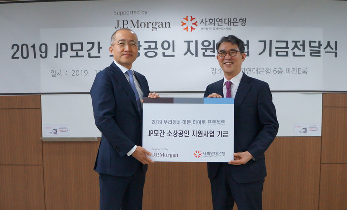 JP모간과 사회연대은행은 소자본으로 창업 후 어려움을 겪고 있는 소상공인의 고충해결을 돕는 ‘우리동네 히든 히어로 프로젝트’ 추진을 위한 기금전달식을 14일에 가졌다.