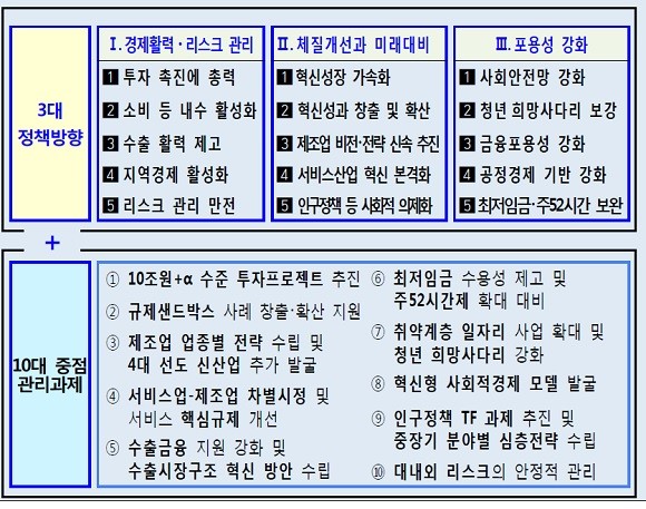 이날 확정된 경제정책방향의 3대 정책방향은 ▲경제활력·리스크 관리 ▲체질개선과 미래대비 ▲포용성 강화 등이다.
