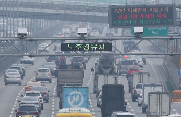 | ▲ 서울 강변북로에 설치된 노후 경유차 단속 CCTV와 알림판. <사진 : 연합뉴스> |