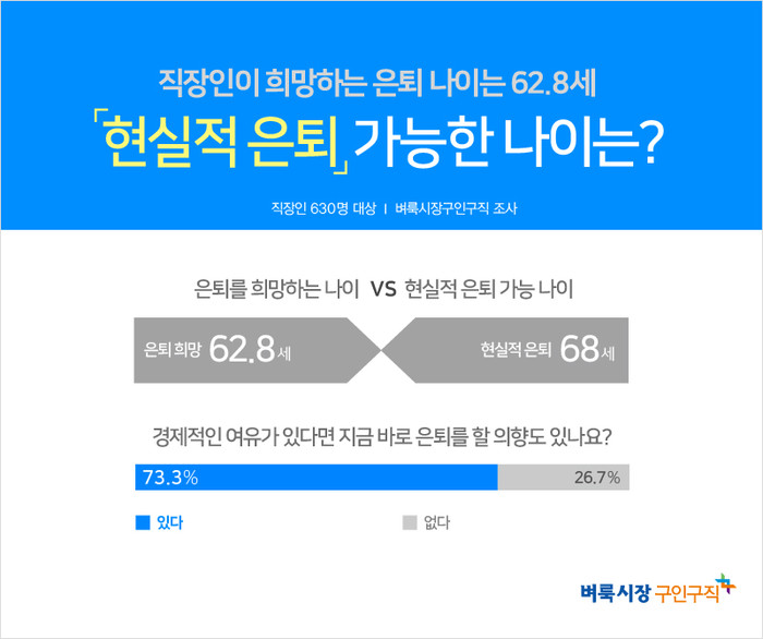 | ▲ 직장인 1242명을 대상으로 설문조사를 진행한 결과 직장인이 희망하는 은퇴 나이는 평균 62.8세, 현실적 은퇴 가능 나이는 68세로 나타났다. |