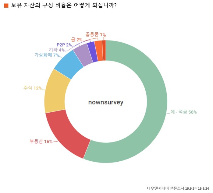 ‘보유 자산의 구성 비율은 어떻게 되십니까?’이란 질문에 대해 ‘예·적금(56%)’이 가장 많은 응답을 차지하였고 그 뒤를 이어 ‘부동산(16%)’, ‘주식(12%)’, ‘가상화폐(7%)’, 순으로 나타났다.