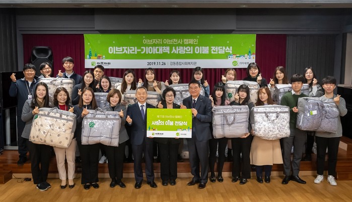 이브자리는 26일 오전 서울시 강동구에 위치한 강동종합사회복지관서 이영희 이브자리 부사장, 임정백 강동종합사회복지관장이 참석한 가운데 ‘2019 사랑의 이불 전달식’을 갖고 이불을 전달했다.