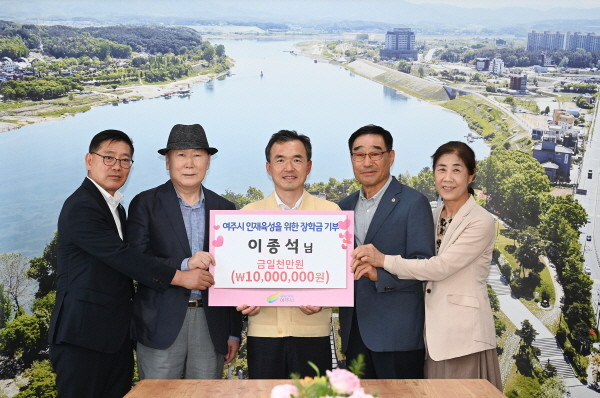 | ▲ 이항진 여주시장이 지난 19일 1000만원 장학금을 기탁한 이종석 씨와 기념촬영을 하고 있다. (사진제공=여주시) |