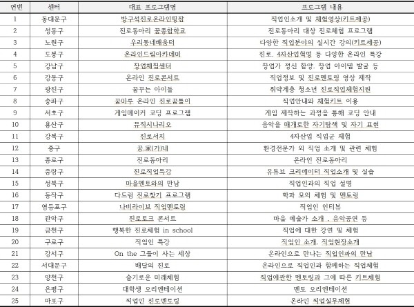 | ▲ 25개 진로직업체험지원센터 주요 온라인 진로체험 프로그램 운영 현황 (자료=서울시교육청) |