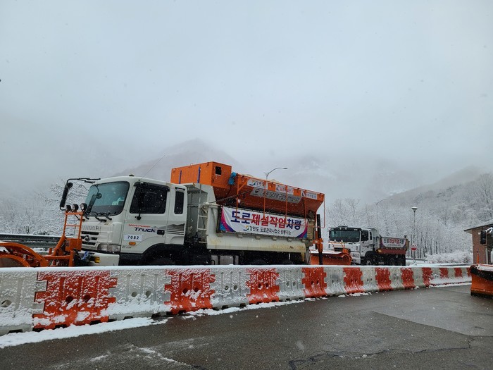 설악산 인근 도로에서 제설작업을 하기 위해 제설차량이 준비중에 있다. 2021.01.23.