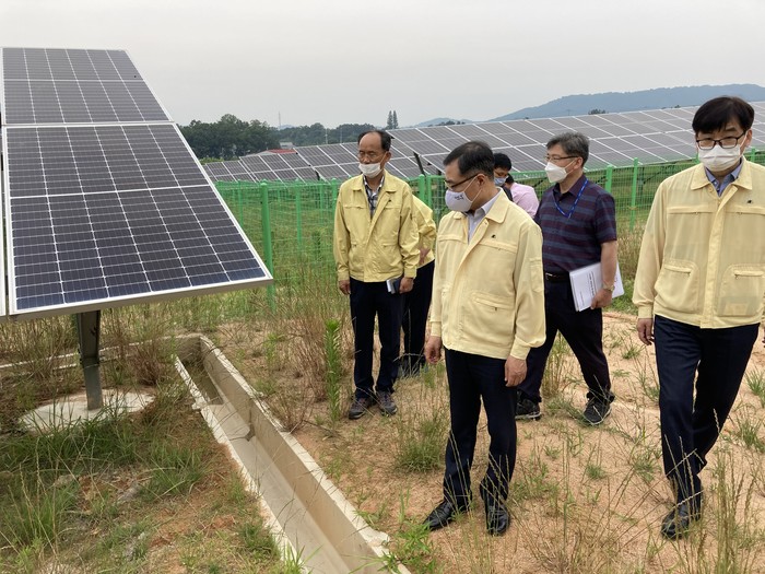 | ▲ 최병암 산림청 차장(왼쪽에서 두번째)이 본격적인 장마철 대비 산지 태양광시설을 점검 하고 있다 <사진제공=산림청> |